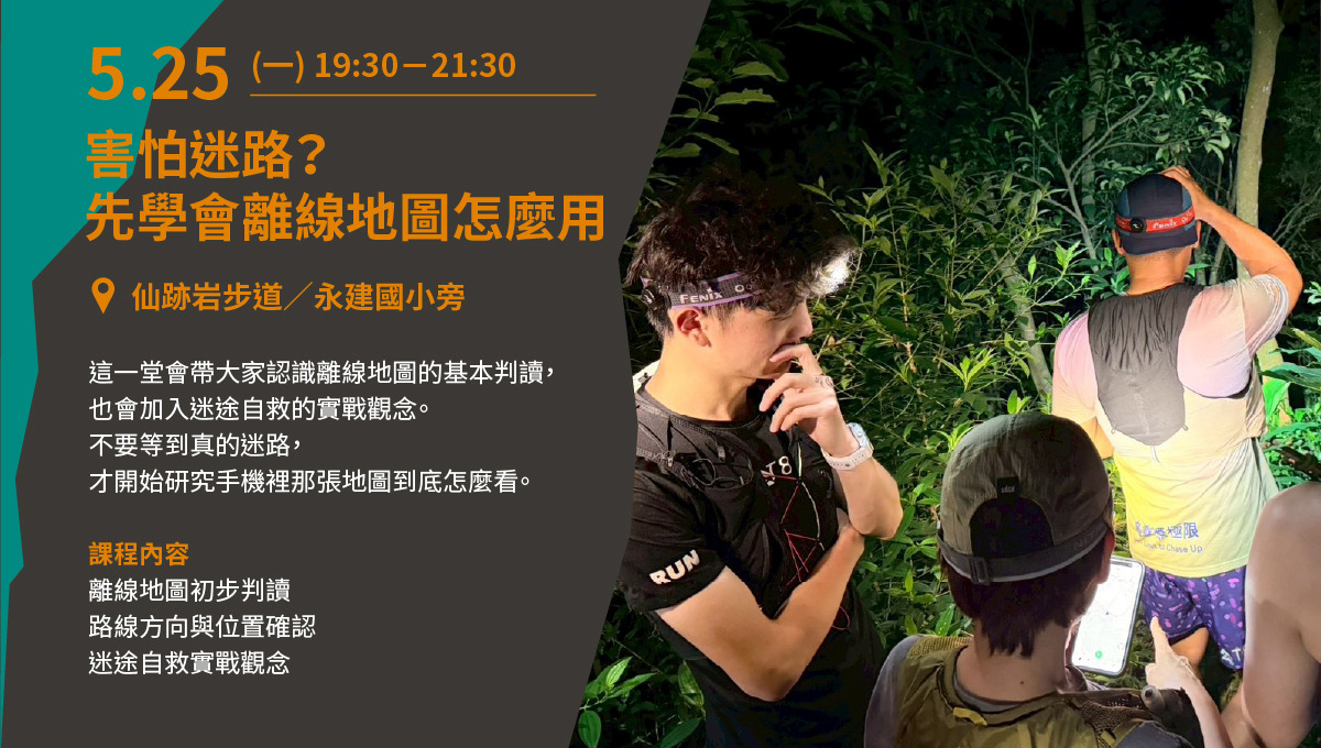 5/18(一)19:30-21:30 [從湖岸到白鷺鷥山的野徑探索] | 5/25(一)19:30-21:30 [害怕迷路?先學會離線地圖怎麼用]